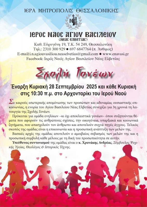 Σε καιρούς εσωτερικής απομόνωσης των προσώπων και αδυναμίας ουσιαστικής επικοινωνίας, η ενορία του Αγίου Βασιλείου Νέας Ελβετίας συνεχίζει για 3η χρονιά τη λειτουργία της Σχολής Γονέων.