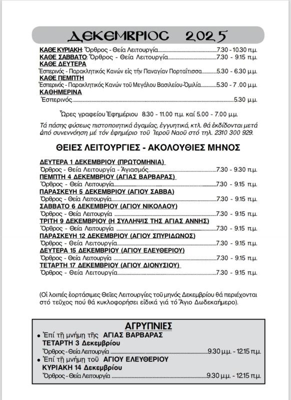 ΔΕΚΕΜΒΡΙΟΣ 2025 ΠΡΟΓΡΑΜΜΑ ΛΕΙΤΟΥΡΓΙΚΗΣ ΖΩΗΣ ΙΕΡΟΥ ΝΑΟΥ ΑΓΙΟΥ ΒΑΣΙΛΕΙΟΥ ΝΕΑΣ ΕΛΒΕΤΙΑΣ