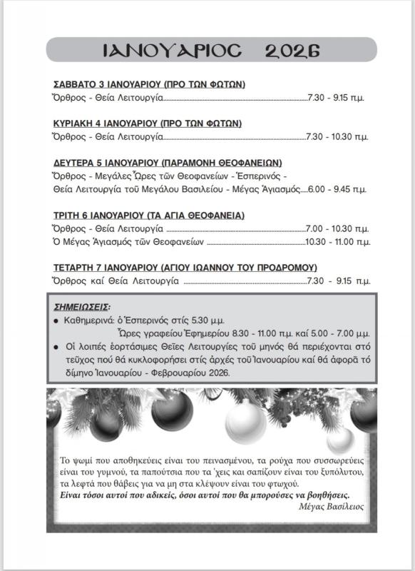 Προς πνευματική σας ωφέλεια, έχει εκδοθεί το πρόγραμμα της λειτουργικής ζωής του Ιερού μας Ναού για το Άγιο Δωδεκαήμερο, το οποίο περιλαμβάνει όλες τις ιερές Ακολουθίες της περιόδου. Το έντυπο πρόγραμμα διατίθεται από τα παγκάρια του Ιερού Ναού, και η προαιρετική οικονομική ενίσχυση που το συνοδεύει διατίθεται για τη στήριξη του φιλανθρωπικού και ποιμαντικού έργου της ενορίας.